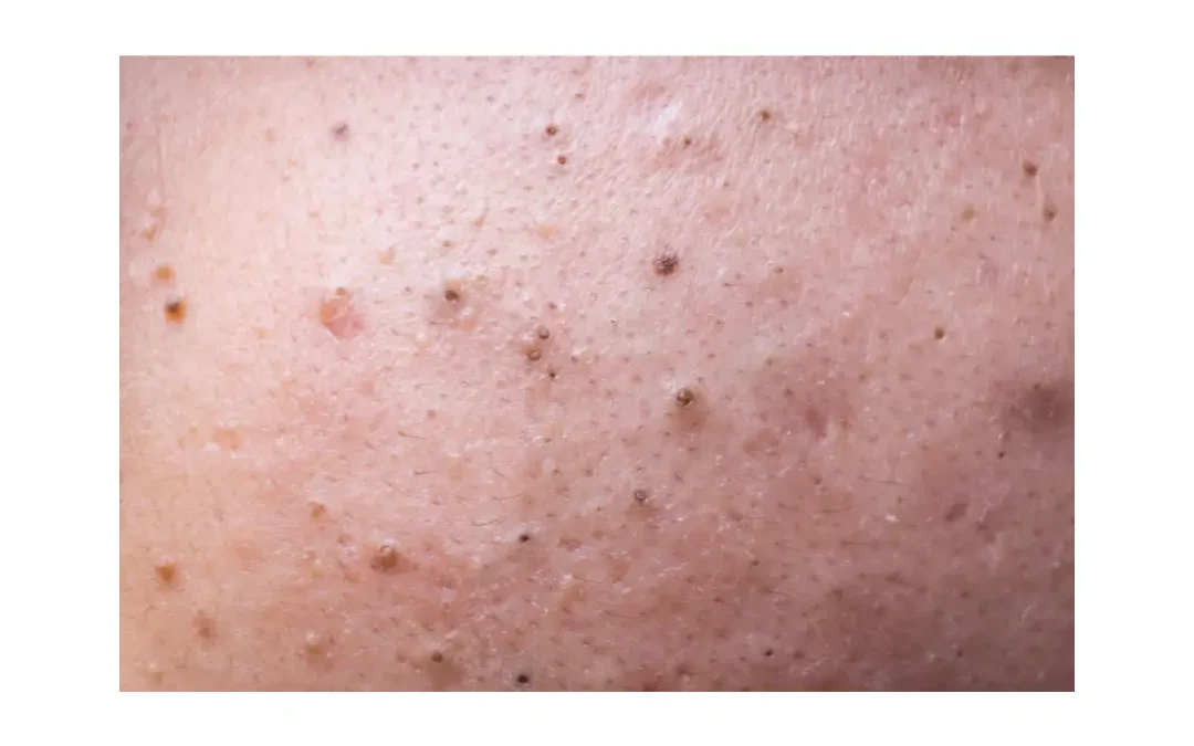 Los puntos negros son folículos del pelo con una escama de queratina, bacterias y sebo. Estrictamente, para el dermatólogo, los puntos negros son comedones, en este caso comedones cerrados. El color se debe a la oxidación del material de la superficie abierta.